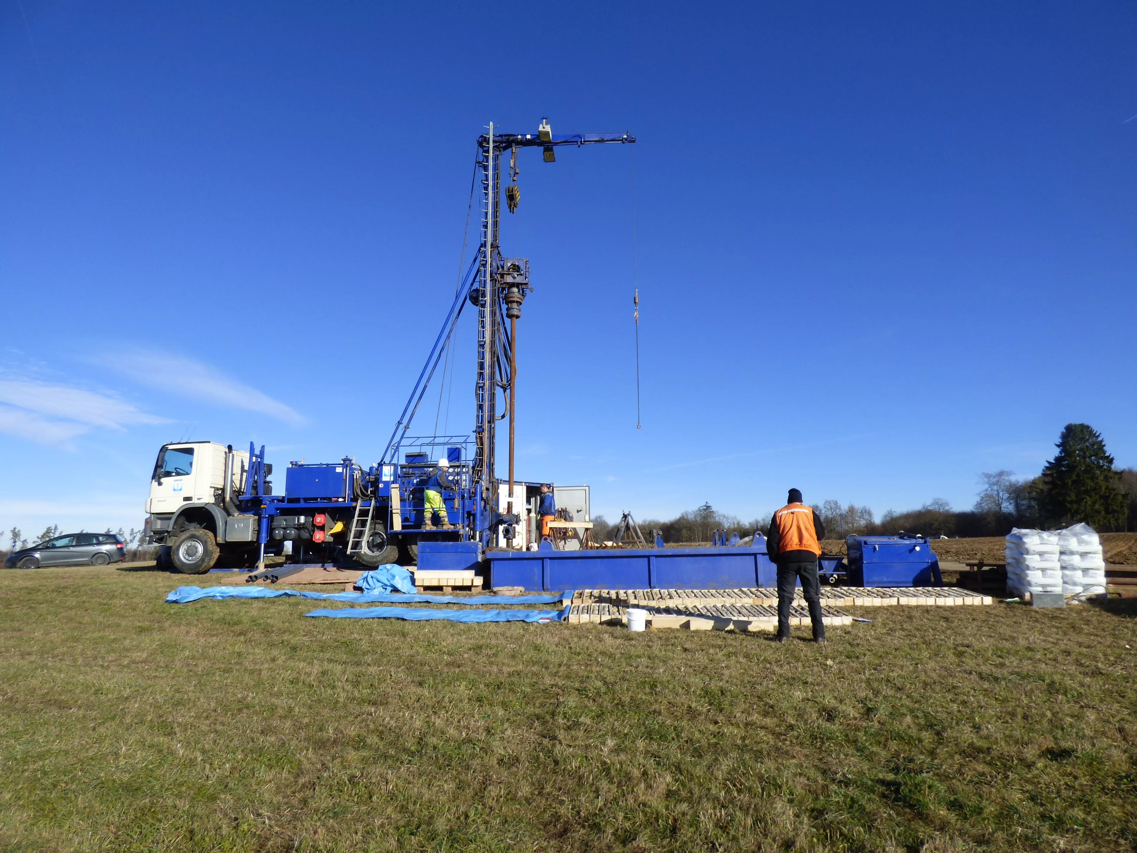 Blick auf einen blauweißen LKW mit montiertem Bohrturm vor blauem Himmel auf einer Wiese. Zwei Personen bedienen das Bohrgerät. In der unteren Bildhälfte sind schmale Holzkisten mit Bohrkernen ausgelegt. Eine Person in oranger Weste in Rückenansicht steht vor den Holzkisten und betrachtet diese.