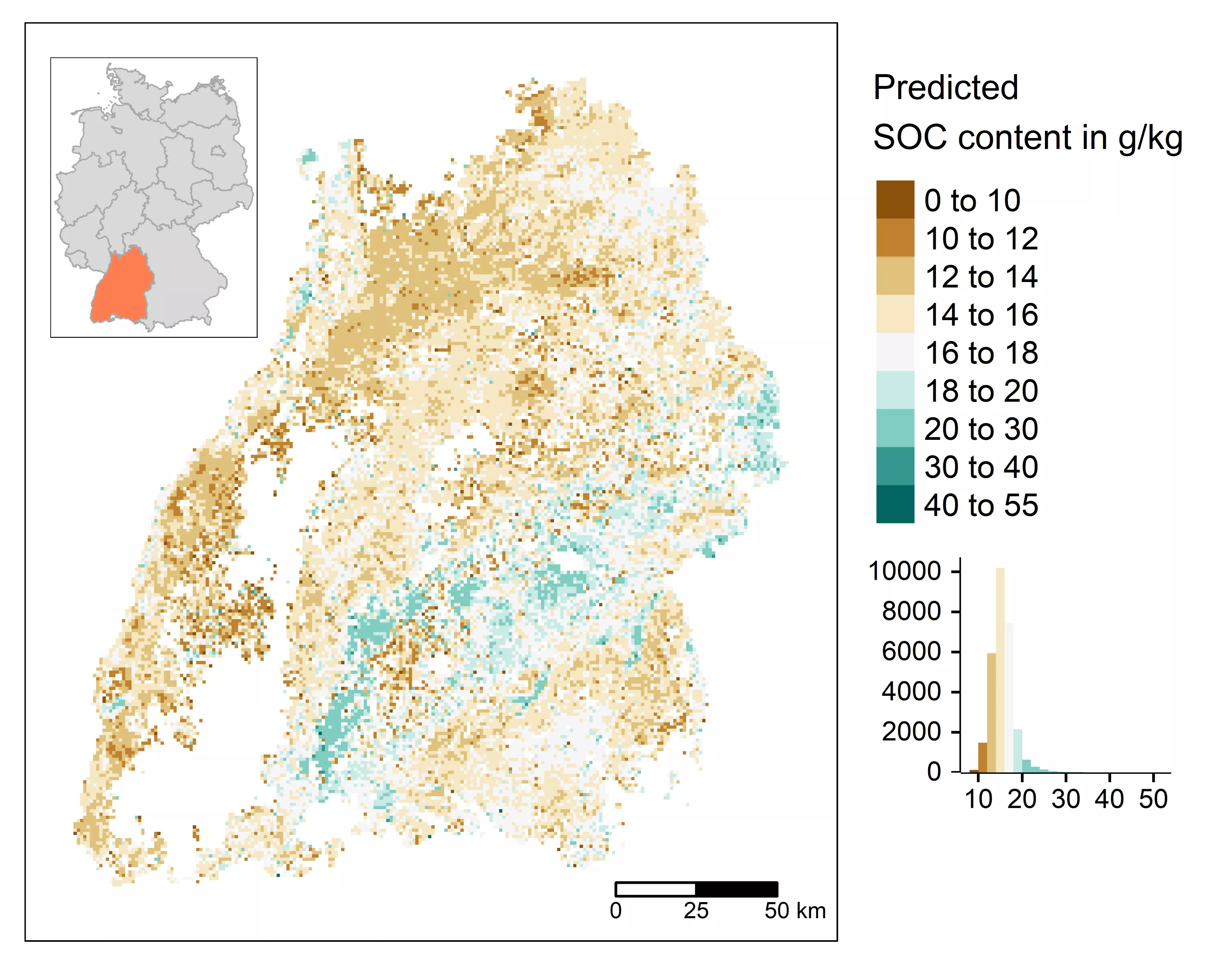 Hauptziel des Projekts war die Erstellung von Bodeneigenschaftskarten, z. B. zum organischen Bodenkohlenstoffgehalt und zum Tongehalt, mittels maschineller Lernverfahren (Random Forest). Für diesen Zweck wurden mehrere Hundert Referenzdatensätze, vorwiegend aus den umfangreichen Datenbanken des LGRB, mit Satellitenbildszenen der Jahre 2018, 2019, 2020 und 2021 kombiniert. Ein weiterer Fokus während der Projektzeit lag auf dem Aufbau einer Spektralbibliothek für die Böden des Landes Baden-Württemberg. Bis Projektende wurden knapp 5000 repräsentative Bodenproben aus dem LGRB-Archiv in einem eigens am LGRB eingerichteten Spektroskopie-Labor eingemessen. Ergänzend zur Ableitung chemischer und physikalischer Bodenkenngrößen wurde im Rahmen des BopaBW-Projekts die Eignung von Sentinel‑1‑Radardaten hinsichtlich des Monitorings, z. B. von Moorsetzungen in Baden-Württemberg, getestet.