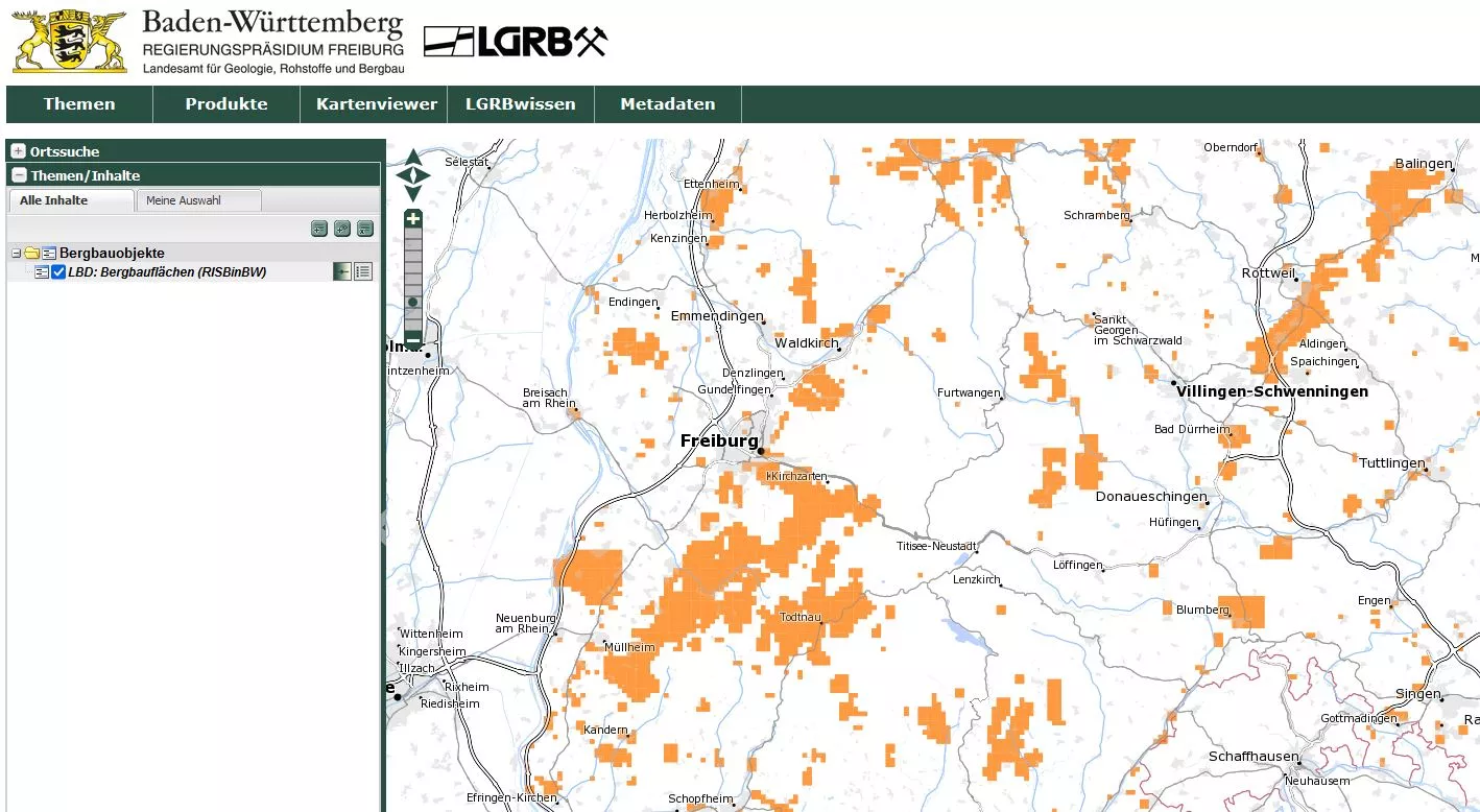 Die kostenfreie Kartenanwendung im Internet ermöglicht den Informationsabruf über die Lage der aktiven Bergbaubetriebe in Baden-Württemberg sowie über Gebiete, in denen mit Relikten des alten Bergbaus früherer Jahrhunderte zu rechnen ist. In RISBinBW sind auch die öffentlich-rechtlichen Bergbauberechtigungen und Lokationen stillgelegter Hohlräume hinterlegt, die nicht bergbaulichen Ursprungs sind.